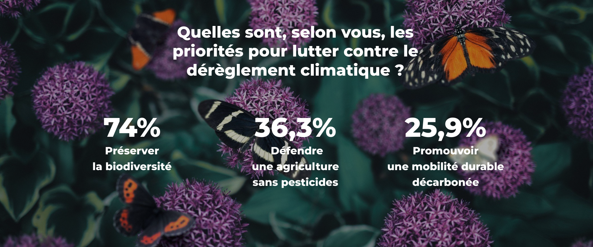 Interrogés sur les priorités d'action, les Français expriment une vision cohérente et ambitieuse. La préservation de la biodiversité arrive largement en tête (74%), confirmant l'intuition que la crise écologique dépasse la seule question climatique. Cette priorité absolue est suivie par la défense d'une agriculture sans pesticides (36,3%), la mobilité durable (25,9%) et l'élevage écologique (26%). Ces choix illustrent une compréhension systémique des enjeux environnementaux, où climat, biodiversité et modes de production forment un tout indissociable. L'alimentation responsable qui ne recueille "que" 23% des suffrages en tant que priorité, irrigue en réalité l'ensemble des préoccupations exprimées.