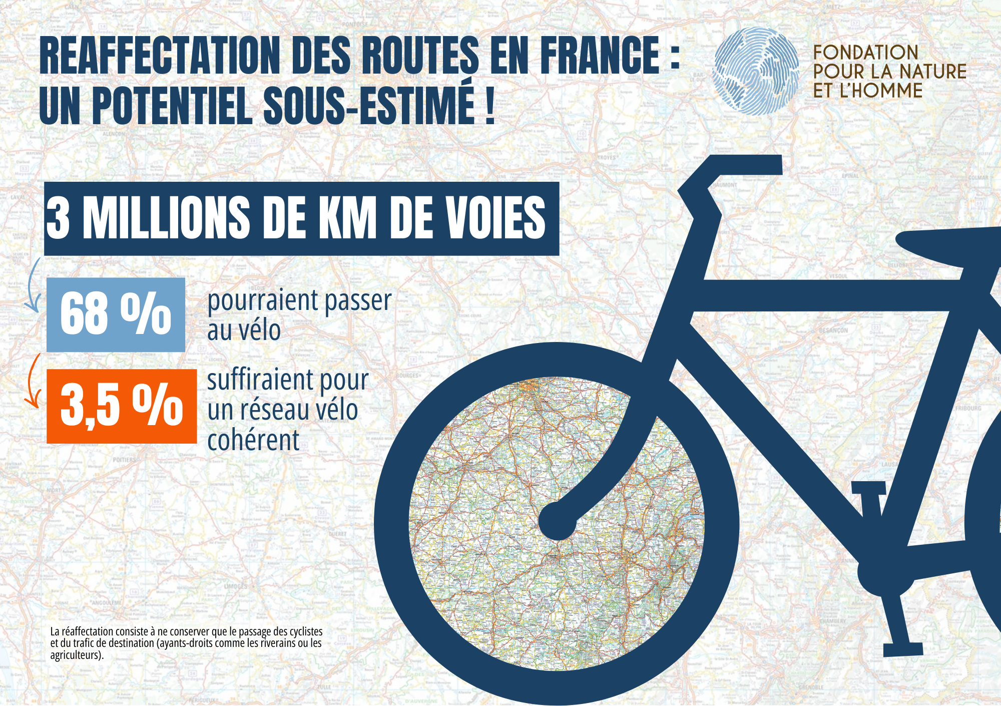 Seul 3,5% du réseau suffirait pour connecter les territoires à vélo, dont la moitié ferait l’objet d’une réaffectation (sans aménagement complémentaire).